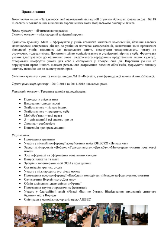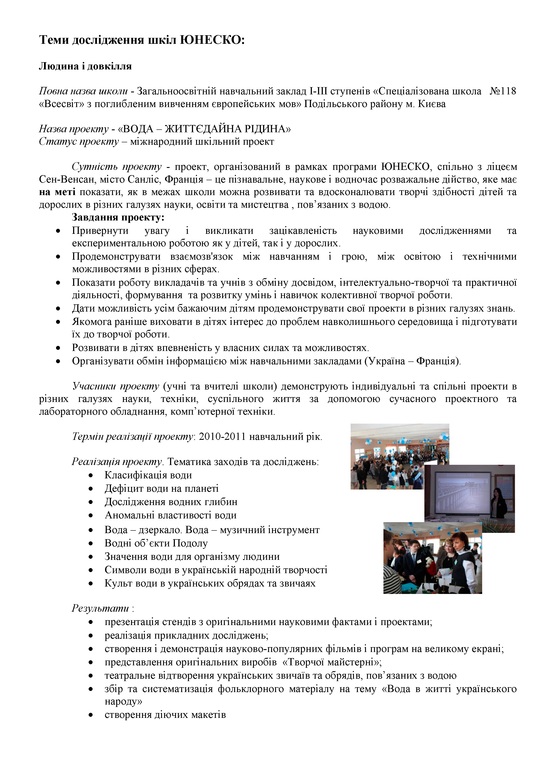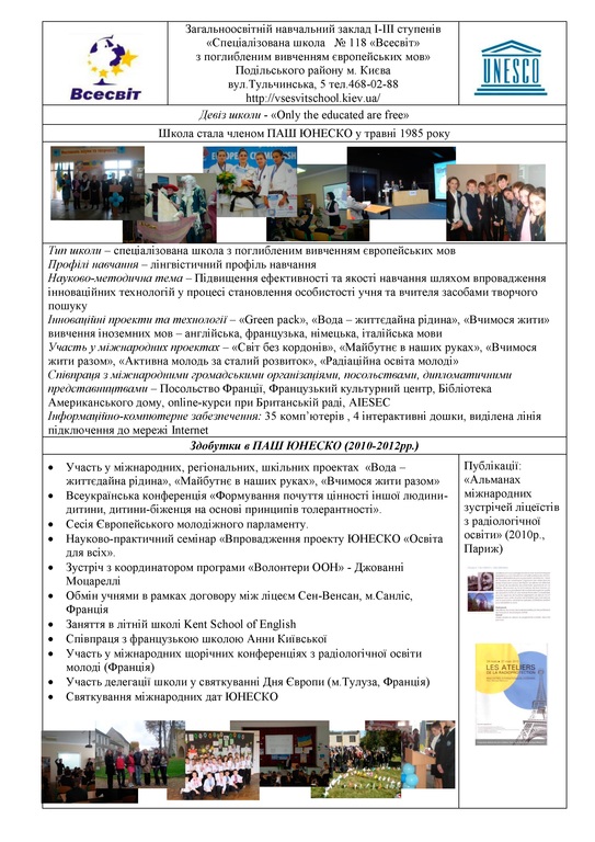 У кінці травня 2015 року українська делегація у складі шести учнів 10-х класів СШ № 118 «ВСЕСВІТ» узяла участь у Міжнародній конференції «Зміна клімату – глобальний виклик людству», яка відбувалась в місті Тулузі, Франції. Питання та проблеми, порушені під час конференції є актуальними у наш час. Для обговорення глобальних питань приїхали делегації з різних країн, таких як: