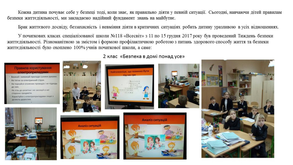 Як же, хочеться усім нам, дорослим,уберегти своїх дітей від неприємностей, захистити від небезпеки, яка очікує на них недосвідчених і цікавих, на кожному кроці. Але чи можливо щохвилини бути поруч? Звичайно ні… Вихід один – навчити малюків правил безпечної поведінки, сформувати у них відповідні навички,щоб діти могли почуватися безпечно. Навчаємо дітей протягом усього року, а посезонно,як завершальний акорд роботи, проводимо «Тиждень безпеки» З « 11» грудня по « 15» грудня 2017 р. був проведений "Тиждень знань з основ безпеки життєдіяльності». Для проведення "Тижня знань з основ безпеки життєдіяльності" був складений «План підготовки до проведення "Тижня знань з основ безпеки життєдіяльності"» і «План проведення "Тижня знань з основ безпеки життєдіяльності"».
